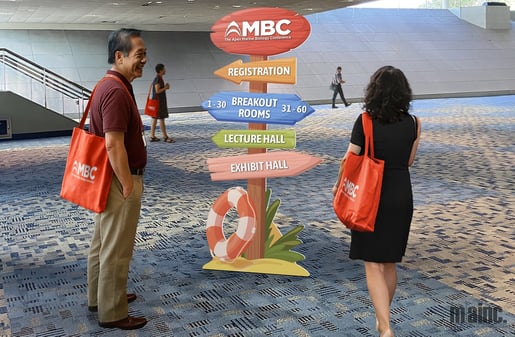Custom-cut directional signposts take your wayfinding beyond the standard rectangle by using die-cut arrows, icons, mascots, or event theme-driven shapes to guide attendees intuitively through your space. Because these signs can be tailored to match an event’s branding, host city, or overall aesthetic, they create an immersive experience that feels intentional rather than simply functional. Think host city skyline silhouettes for citywide conferences, branded icons for sponsor zones, or playful stacked shapes for festivals and experiential activations. These signposts work especially well in lobbies, outdoor venues, and intersections where quick decision-making is critical, as these types of designs are naturally eye-catching to help attendees navigate without hesitation. They’re a creative and memorable way to make an impact while also making sure attendees make it to the next must-see breakout or ensure they don’t miss a much-needed coffee or snack break.