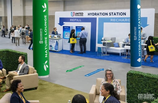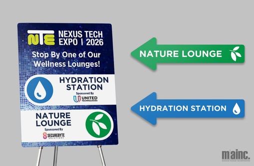 Sometimes the most effective wayfinding isn’t a single sign, but rather a coordinated visual system that guides attendees at every turn. Color-coded zones use a consistent visual language to help attendees instantly understand where they are and where they’re headed. Large, bold column wraps act as the primary visual markers for areas like a Green Zone wellness lounge or Blue Zone networking space, while coordinating the smaller branded details within the zone like table throws, easel signs, banners, and even floor or wall decals to carry the same color identity throughout the zone for a quick and easy way attendees can orient themselves with just a glance. This layered approach creates endless opportunities for creativity, from sponsor-branded palettes to thematic color stories, while making navigation feel organic and effortless rather than instructional. This type of wayfinding is especially effective in open-area activations, exhibit halls, ballrooms, and high-traffic common areas where repeating the color cue across multiple touchpoints makes the zone impossible to miss, even in a crowded environment.