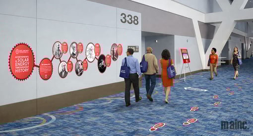 Floor and wall decals transform unexpected surfaces into intuitive, eye-catching wayfinding tools by guiding attendees along clearly marked paths to key destinations like registration, keynote sessions, or featured activations. Instead of relying solely on traditional signage, these graphics use footprints, arrows, patterns, or branded visuals to create a natural flow while their wall decal counterparts reinforce the route at eye level when floor space gets busy. The real creative opportunity comes from turning the journey itself into an experience, such as a playful “yellow brick road” style wayfinding that features fun brand facts or timeline milestones, or color-coded metro-inspired line along your walls graphics that guide guests through a host city–themed event (these work especially well when paired with the color coded zones we mentioned earlier). This type of directional signage excels in hallways, transition spaces, and high-traffic corridors, offering a space-efficient way to blend navigation, storytelling, and branding into one cohesive moment.
