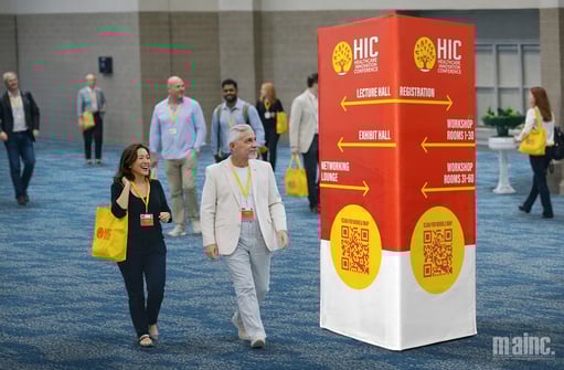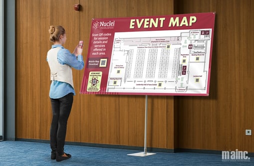 Interactive wayfinding can be achieved through adding QR codes to directional signs, banners, or free-standing graphics, allowing attendees to instantly access maps, schedules, room details, or real-time updates on their phones. These types of integrations are usually extremely cost-effective to implement, especially if you’re using planning software that helps facilitate it. Instead of stopping to ask for help or crowding around a single printed map, guests can scan and keep moving, making this approach especially effective for large campuses, multi-building venues, or events with evolving agendas. The best part about QR touchpoints is that they have almost zero footprint and can be subtly integrated into your existing branded graphics or paired with clear calls to action like “Scan for Your Route” or “Find Sessions Near You.” Even if you’re using reusable graphics, QR codes printed on removable decals keep even the most static signage up to date.