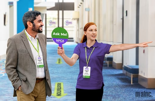 “People power” wayfinding turns staff and volunteers into highly visible navigation tools. The human touch of this approach can’t be understated, and attendees can get personalized direction (along with other helpful info like times, agenda changes, etc.) when they approach staff or volunteers. Outfitting your team in matching branded apparel such as shirts, hats, lanyards, or sashes labeled with clear phrases like “Ask Me,” “Info Crew,” or “Wayfinding Team” can help streamline your efforts. When everyone assisting with directions looks consistent and intentional, attendees instantly know who to approach, eliminating uncertainty and hesitation in a bustling event environment. Consider equipping your team with helpful handheld signage as well for even easier identification or better on-the-go branding. A simple handheld sign outfitted with “Follow me to the Ballroom!” can make a huge difference in keeping crowds moving smoothly.