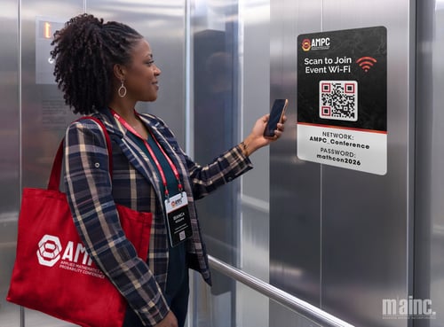 Making it Happen: Add a QR code to table tents or lobby signs that says “Scan to Join Event Wi-Fi”. Because of their small footprint and big impact nature, you can almost never have enough of these types of QR codes. Consider using decals in high-traffic or pause-point areas like elevator interiors, bathroom mirrors, or tabletops to make it easy for attendees to get connected wherever they are.