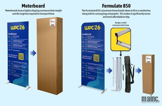 When it comes to event signage, planners are often stuck choosing between impact and practicality. Traditional meter boards offer a strong visual presence but come with higher shipping costs and logistical challenges, while retractable banners are easy to transport but don’t always deliver the elevated or big-impact look that makes messaging both meaningful and memorable. The Formulate 850 was designed to bridge the gap between form and function while simultaneously saving you money. The result is a display solution that not only looks the part, but works smarter behind the scenes. Below, we’ll take a closer look at what sets this fabric banner alternative apart from similar event display solutions and why the Formulate can elevate not just your event, but your planning strategy altogether!