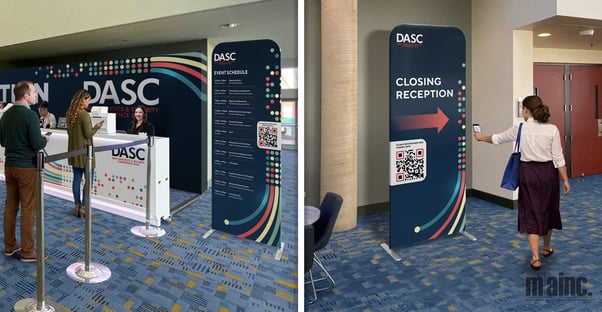 What’s more is that this double-sided capability synergizes perfectly with its on-site flexibility. You might start the day using a single-sided pillowcase graphic at registration for a clean, forward-facing welcome. As traffic shifts, that same display can move into a hallway and transition to double-sided messaging, promoting sponsors on one side and wayfinding or session details on the other. In a breakout area, it can highlight room identification while reinforcing event branding from the reverse side or highlight speaker achievements to get attendees excited for the session at hand.