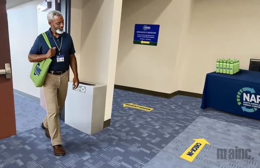 Floor and Wall Decals When space is limited, branding where you can is crucial to creating an inviting, immersive atmosphere and cohesive feel. And when brandable surface options are slim, your floors and walls can become your best marketing assets. As we discussed in the tabletop signage section, decals are one of the most versatile, scalable, and cost-effective tools for maximizing your surface real estate and making a lasting impression. Use them for low-imprint, high-engagement wayfinding and lead attendees from one area to another with fun, custom-cut floor decals throughout your venue’s hallways. Color-coded or die-cut wall decals easily mark areas like restrooms and breakout session rooms, or can be used to add sponsor messaging in unexpected places like elevators, mirrors, escalators, and stair risers! Floor decals can also be used to complement other event infrastructure (like your tabletop setups) by adding pops of branding that don’t require any additional space. When used in conjunction with other branding, these elements help you create an engaging visual flow that feels intentional and elevated without sacrificing valuable foot traffic space.