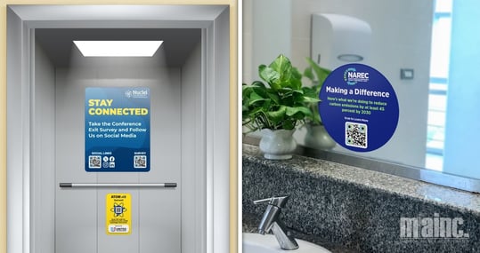 While wall decals are a great lightweight graphics option for these small moments, unique locations sometimes call for unique signage, and a repurposed podium sign is a great way to make your small details even more eye-catching by adding a little more dimension without taking up that much more space. A simple graphic on a bathroom mirror can reinforce your event theme (“You look ready to network!” with event app integration or icebreaker prompt ideas) or deliver a sustainability message (“This event is making a difference” with a QR code linking to a green or social initiative made possible by your event). These small branding moments are also a great way to gamify your event. Treat them like hide-and-seek activations and encourage attendees to scan as many as they can throughout the event to win a prize. It’s a great way to create full venue immersion and interactions with just a little bit of branding.