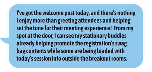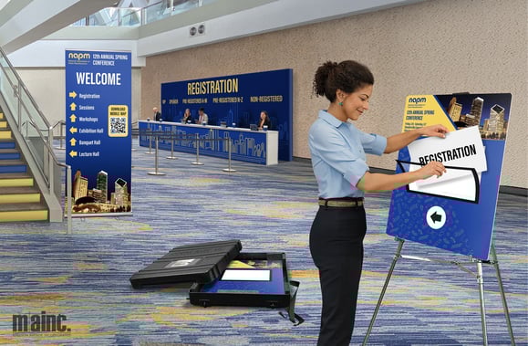 Once your signs arrive, the built-in wheels on your sign shipping case make getting from the loading dock to the ballroom simple. Whether you’re navigating long convention center corridors or tight hotel layouts, it moves easily wherever you need it. Once unpacked, it’s time to build the registration and welcoming hub! First, your mobile sign quickly takes its place near the entrance to welcome attendees as they arrive with a magnetic SMARTlens® insert updated with a clear “Welcome” or “Registration” message is slid into place. These messages can be preprinted from your office or even printed on any standard on-site printer, making last-minute adjustments easy if the registration layout changes.