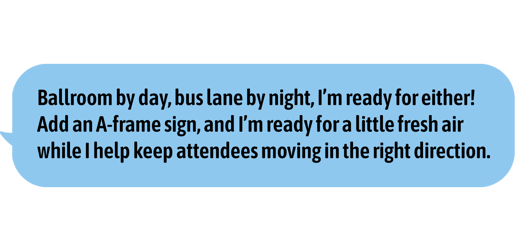 Need even more visibility? Optional color-coded headers or inserts can align with specific routes, wristbands, or hotel assignments to make wayfinding intuitive at a glance. And when paired with A-frames, SMARTsigns® are just as effective outside on the sidewalk as they are inside the venue hall. This is great for events with branching activation options that go off-site and help keep attendees feeling confident about where they are headed next.